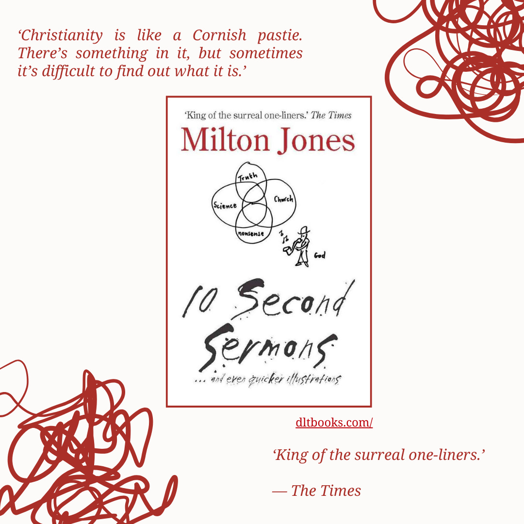 Milton Jones further dissects the great pastie of faith in 10 Second Sermons: … and even quicker illustrations and Even More Concise 10 Second Sermons.
