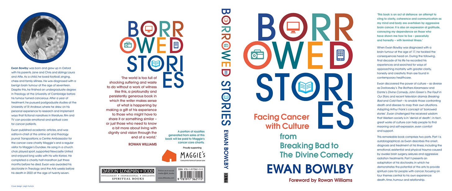 More imminently, in June we will be releasing a superb book by Ewan Bowlby. Some readers of this newsletter may know of Ewan (whose grandfathers were the poet Tony Harrison and a former Bishop of Newcastle, the late Ronnie Bowlby), or even have known him personally, but if not you will meet an impressive character with an impressive mind in Borrowed Stories: Facing Cancer with Culture, from Breaking Bad to The Divine Comedy.